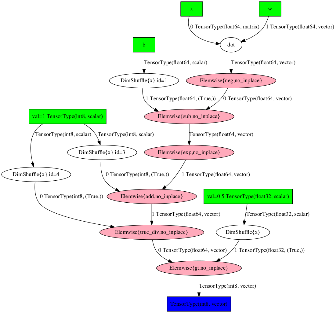 >>> p_1 = 1 / (1 + pt.exp(-pt.dot(x, w)-b)) # Probability of having a one